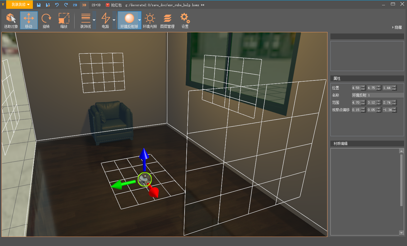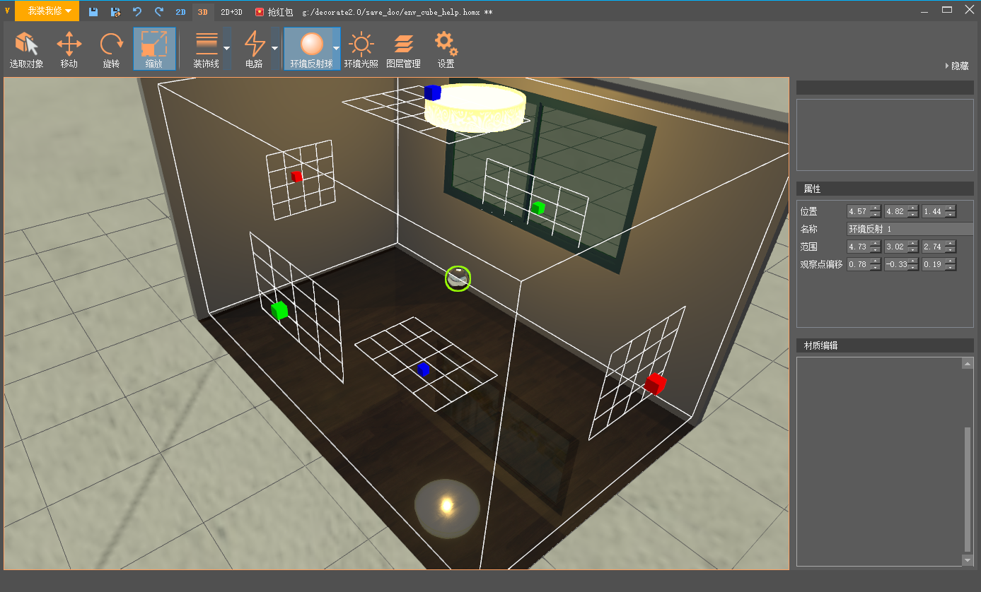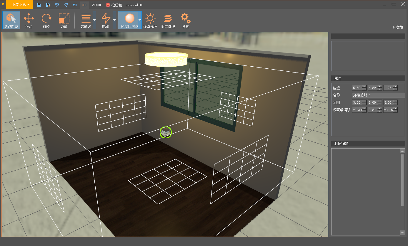 首先点击工具栏上的按钮让户型中所有的环境反射球可见,然后切换到选取对象模式,用鼠标选择一个反射球。选择了反射球后,3D空间中会显示这个反射球的Box区域。